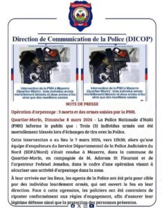WhatsApp Image 2026-03-09 at 10.36.34 AM Continue ReadingPrevious 3 hommes armés tués, 2 armes et plusieurs munitions saisies lors d’une opération à Quartier-Morin, selon la PNH