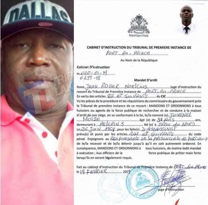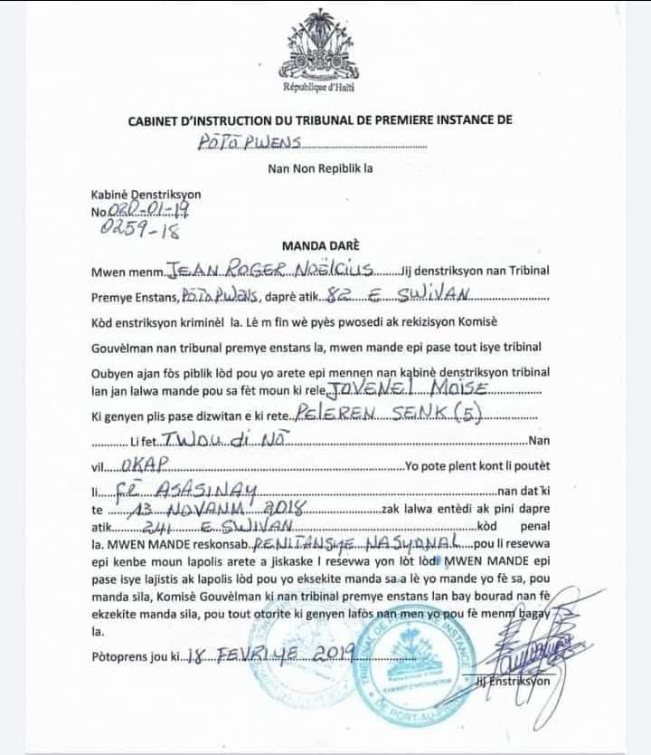 Capture d’écran du mandat d’arrêt émis le 18 février 2019 par l’ancien juge haïtien Jean Roger Noëlcius lié à l’assassinat de Jovenel Moïse, version créole.