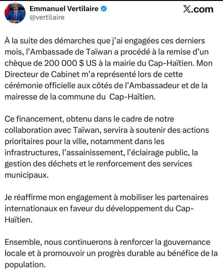 Les récentes déclarations d’Emmanuel Vertilaire, qui se félicite d’avoir obtenu un chèque de 200 000 dollars de l’Ambassade de Taïwan pour la mairie du Cap-Haïtien, illustrent tristement une dérive désormais banale dans la politique haïtienne : transformer des gestes d’assistance mineurs en trophées diplomatiques. Présentée comme une réussite personnelle, cette annonce ne révèle rien d’autre que l’enracinement d’une dépendance chronique envers les dons étrangers, une dépendance que certains responsables semblent désormais considérer comme une forme de gouvernance normale.