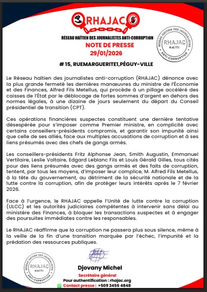 Le 29 janvier 2026, le RHAJAC dénonçait les pratiques jugées illégales du ministre de l’Économie et des Finances, Alfred Fils Metellus, accusé de « procéder à un pillage accéléré des caisses de l’État » en dehors des normes légales. Ces opérations auraient été menées en complicité avec les conseillers-présidents Fritz Alphonse Jean, Smith Augustin, Emmanuel Vertilaire, Leslie Voltaire, Edgard Leblanc Fils et Louis Gérald Gilles, pour garantir leur impunité et renforcer leur influence politique avant la fin officielle de la transition.
