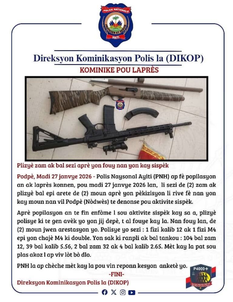 La Police nationale d’Haïti (PNH) a annoncé avoir saisi plusieurs armes à feu et une importante quantité de munitions, et...