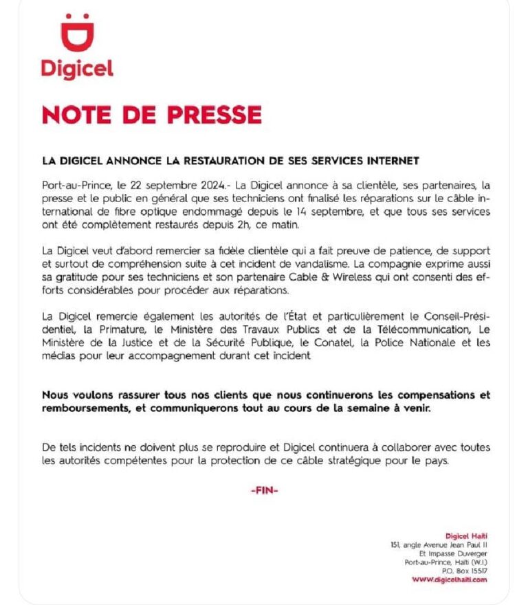 La Digicel a informé que ses services Internet sont entièrement rétablis après un incident de vandalisme qui les avait totalement...