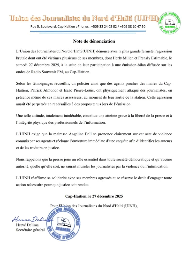 IMG-20251229-WA0029 Continue ReadingPrevious Cap-Haïtien : l’UJNH dénonce une agression contre des journalistes après une émission radiophonique