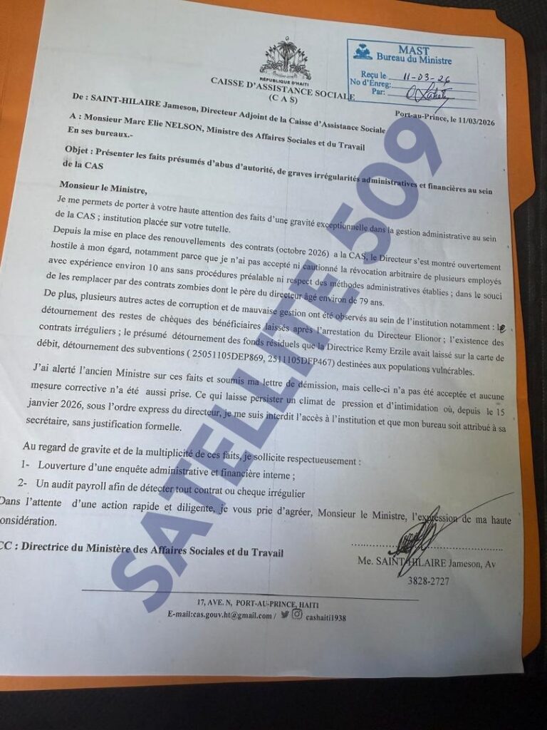 Une lettre explosive adressée au ministre des Affaires sociales et du Travail, Marc Elie Nelson, met en cause la gestion du directeur général de la Caisse d’Assistance sociale (CAS), Raphaël Johny.