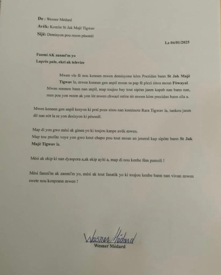 Wesner Médard, président de la bande Saint-Jacques Majeur de Petit-Goâve, a annoncé sa démission le 4 janvier 2025. Dans une...