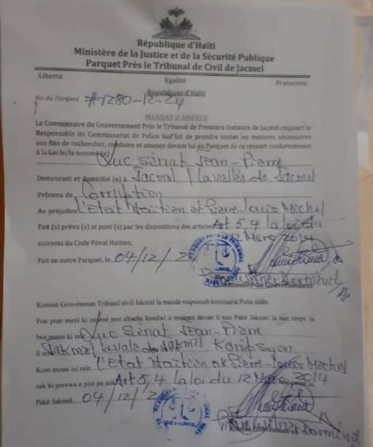 Le commissaire du gouvernement près le Tribunal de première instance de Jacmel a émis un mandat d'amener à l'encontre de...