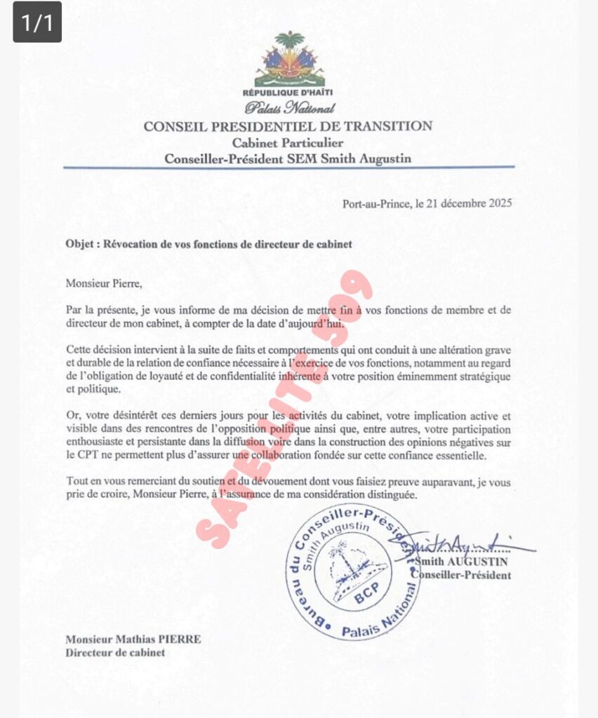 Une correspondance officielle datée du 21 décembre 2025, émise depuis le Palais national, révèle une nouvelle secousse politique majeure au sein du Conseil présidentiel de transition (CPT).