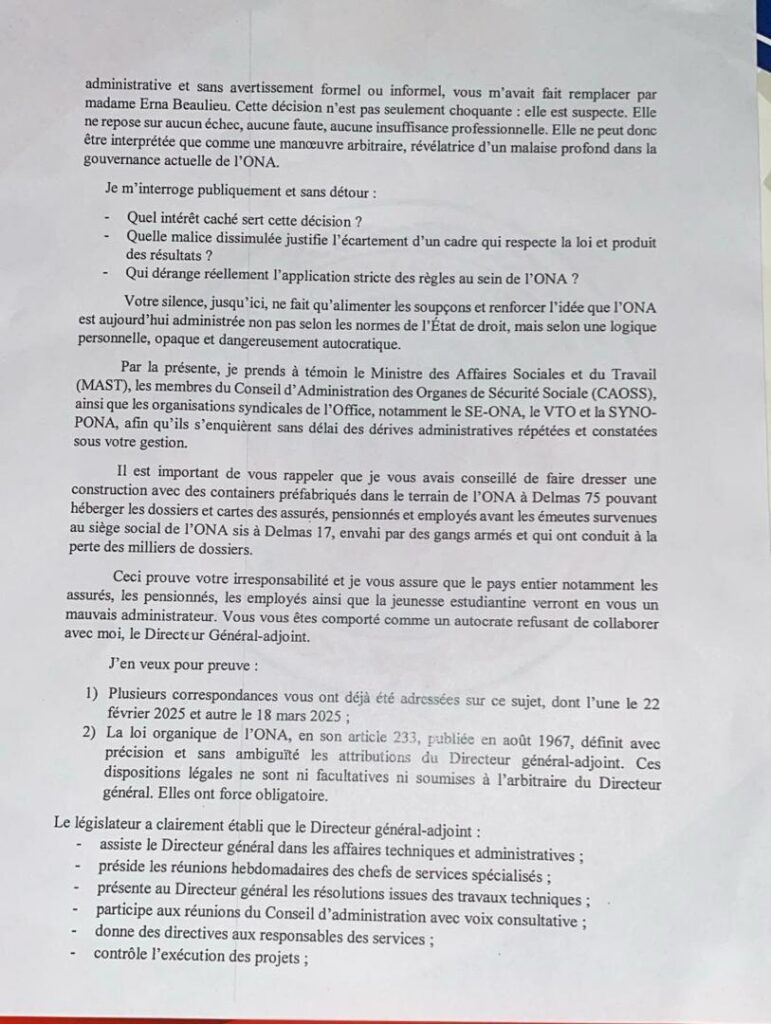 La correspondance évoque aussi la perte de milliers de dossiers lors de l’invasion du siège de l’ONA à Delmas 17 par des gangs armés. Le DGA affirme avoir recommandé auparavant l’installation d’archives sécurisées dans des structures préfabriquées à Delmas 75. Il écrit que le refus d’appliquer cette mesure « prouve une irresponsabilité » et accuse le Directeur général de s’être « comporté comme un autocrate refusant de collaborer avec moi ». Il soutient que l’institution est aujourd’hui dirigée « selon une logique personnelle, opaque et dangereusement autocratique ».