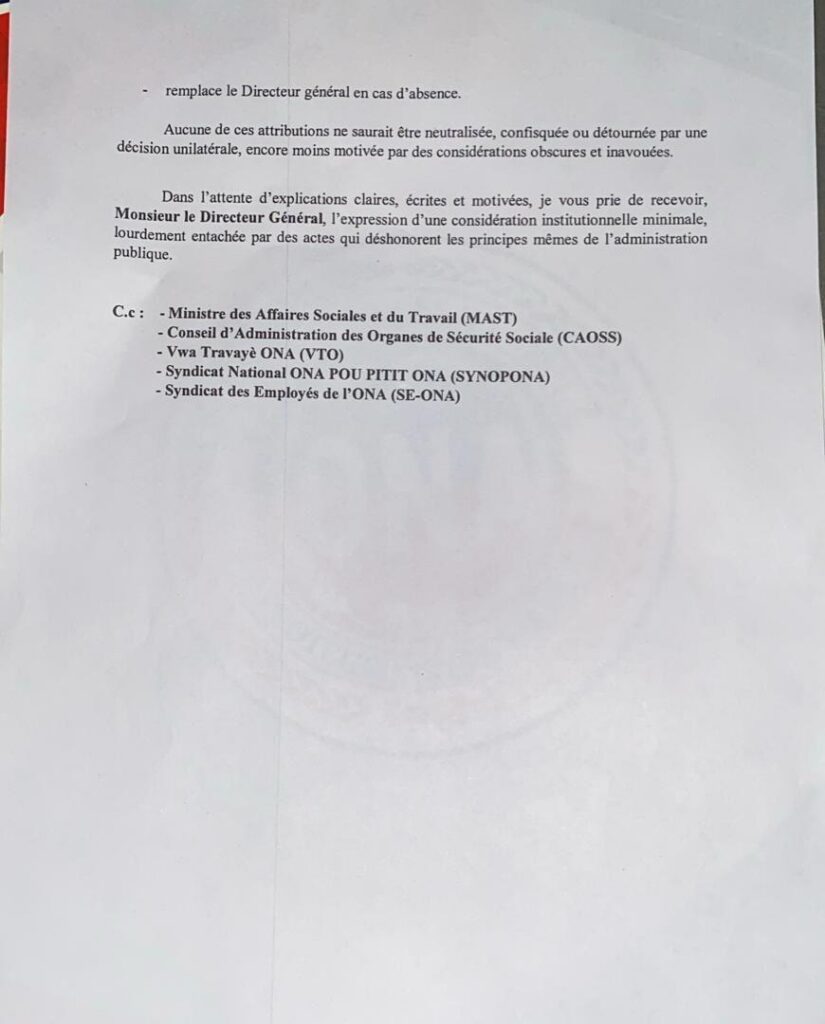 Capture d’écran de la correspondance officielle du DG adjoint de l’ONA dénonçant des décisions arbitraires, des abus d’autorité et une corruption présumée dans la gestion de l’institution, en date du 5 février 2026. (2/3).