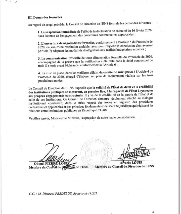 Le Conseil de direction de l’ENS souligne d’abord une grave irrégularité procédurale. Le Protocole de 2020 prévoit clairement, en cas de différend, une résolution graduée passant par le dialogue, puis la médiation du Protecteur du citoyen, avant tout recours administratif. Or, aucune de ces étapes n’a été respectée. Pour l’ENS, cette décision unilatérale constitue une violation manifeste des clauses contractuelles librement consenties par l’État haïtien.