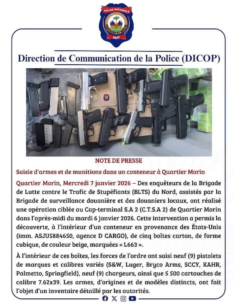 La Police nationale d’Haïti (PNH) annonce une importante saisie d’armes et de munitions réalisée dans un conteneur en provenance des États‑Unis, au Cap‑terminal S.A 2 (C.T.S.A 2) de Quartier Morin. L’opération, menée mardi 6 janvier 2026 par la Brigade de lutte contre le trafic de stupéfiants (BLTS) du Nord, avec l’appui de la Brigade de surveillance douanière et des douaniers locaux, a permis la découverte de neuf pistolets, neuf chargeurs et 5 500 cartouches dissimulés dans cinq boîtes carton marquées « L663 ».