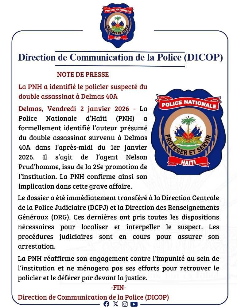 La Police nationale d’Haïti (PNH) a annoncé avoir identifié le policier suspecté d’être l’auteur présumé du double assassinat survenu à Delmas 40A dans l’après-midi du 1er janvier 2026. Dans une note de presse publiée ce vendredi 2 janvier 2026 par la Direction de communication de la Police (DICOP), l’institution précise qu’il s’agit de l’agent Nelson Prud’homme, issu de la 25e promotion de la PNH.