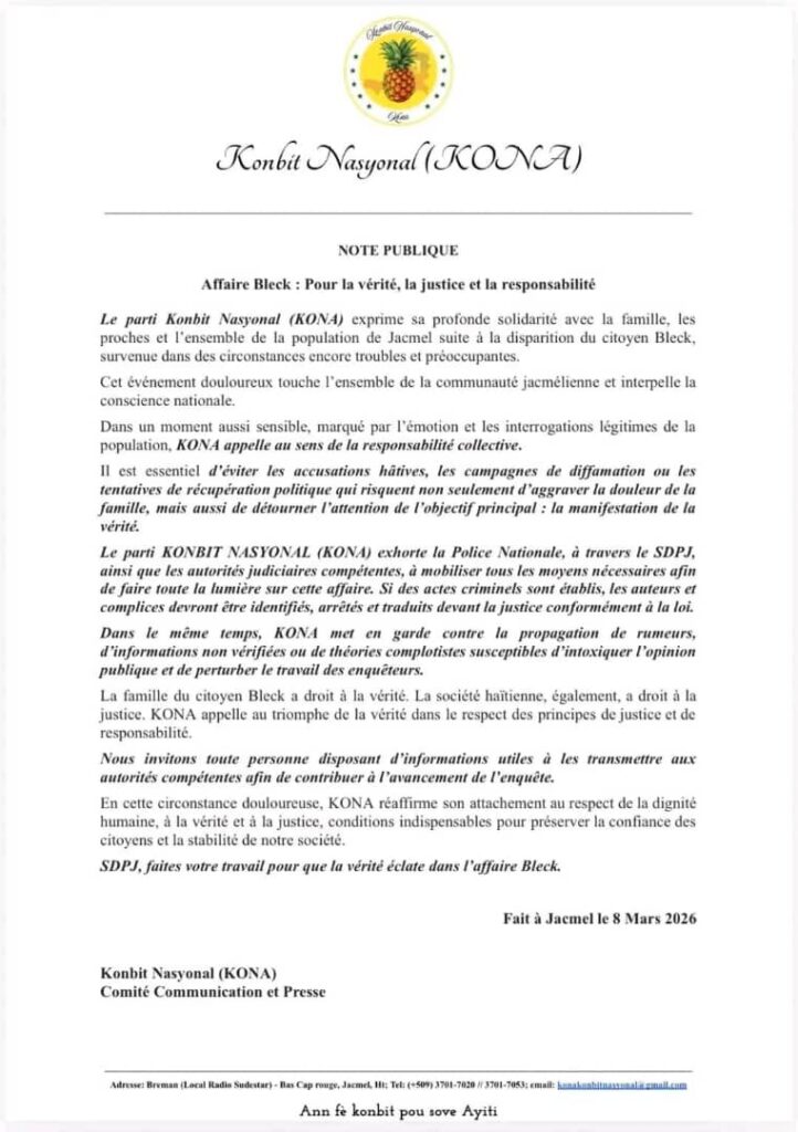 Plus d’un mois après la disparition du citoyen Jacques Bleck à Jacmel, l’affaire continue de susciter inquiétudes et interrogations. Dans une note publique publiée ce dimanche 8 mars 2026, le parti Konbit Nasyonal (KONA) affirme que cette disparition ne peut être traitée comme un simple fait divers et appelle les autorités à faire toute la lumière sur ce dossier.