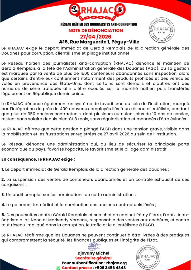 « Les Douanes ne peuvent continuer à être livrées à des pratiques qui compromettent la sécurité, les finances publiques et l’intégrité de l’État », martèle le réseau dirigé par Djovany Michel.