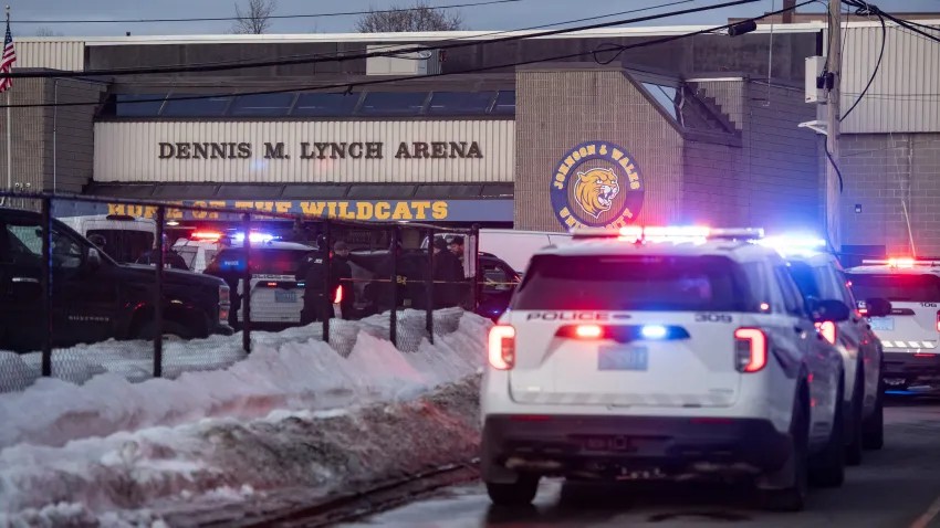 La police se tient à l’extérieur du périmètre qu’elle a établi autour de la Dennis M. Lynch Arena, où une fusillade a eu lieu plus tôt dans la journée à Pawtucket, Rhode Island, le lundi 16 février 2026.