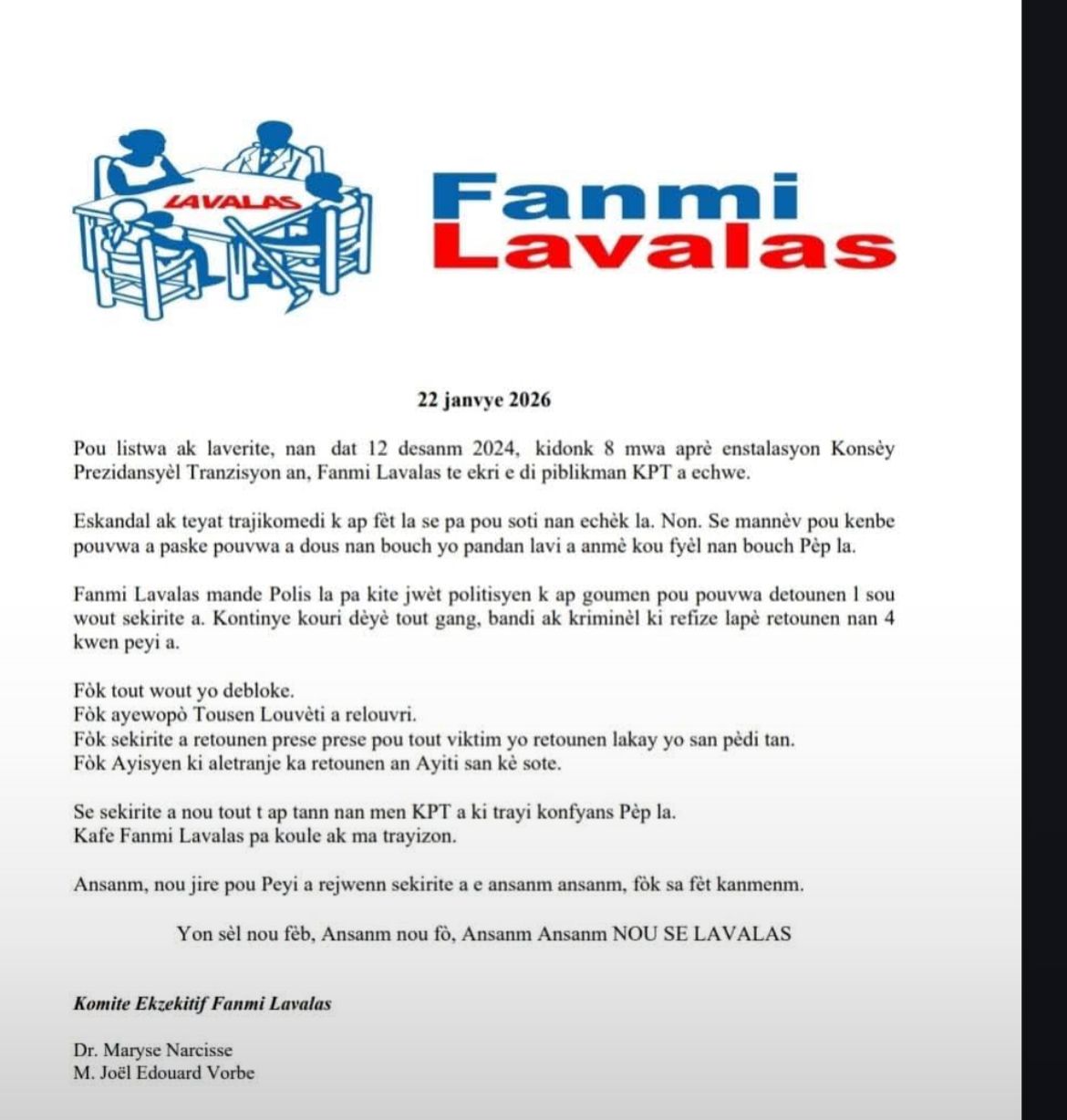IMG-20260123-WA0006 Continue ReadingPrevious Fanmi Lavalas accuse le CPT et appelle à une reprise totale de la sécurité nationale