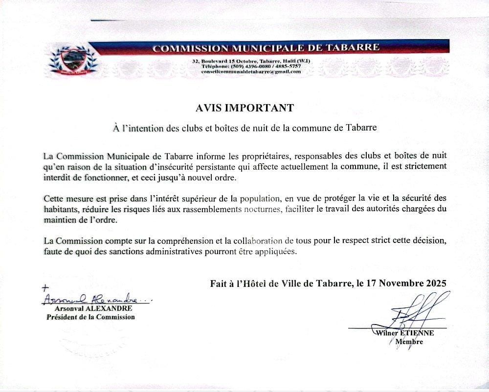 La Commission municipale de Tabarre a annoncé, dans un avis publié ce lundi 17 novembre 2025, la fermeture immédiate de tous les clubs et boîtes de nuit de la commune en raison de la détérioration persistante de la situation sécuritaire. Les autorités locales affirment que cette mesure restera en vigueur « jusqu’à nouvel ordre ».