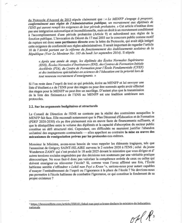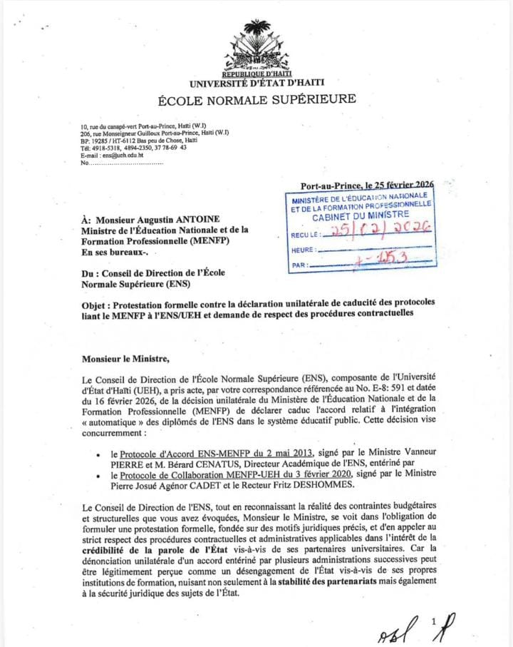 Les étudiants dénoncent le retrait intégral d’une note publiée le 16 février, qu’ils considèrent comme une atteinte aux prérogatives de l’ENS telles que définies par le décret-loi de 1947. Selon eux, ce retrait remet en cause la mission historique de l’institution : former un corps de professeurs hautement qualifiés pour l’enseignement secondaire en Haïti. Les signataires précisent que leur mouvement « ne vise aucunement à compromettre le bon fonctionnement du système éducatif », mais à défendre les principes fondateurs de l’établissement.