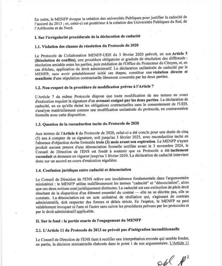 Capture d’écran de la lettre officielle adressée par le Conseil de direction de l’École normale supérieure au ministère de l’Éducation nationale et de la Formation professionnelle, contestant la décision de déclarer caducs les protocoles liant les deux institutions.