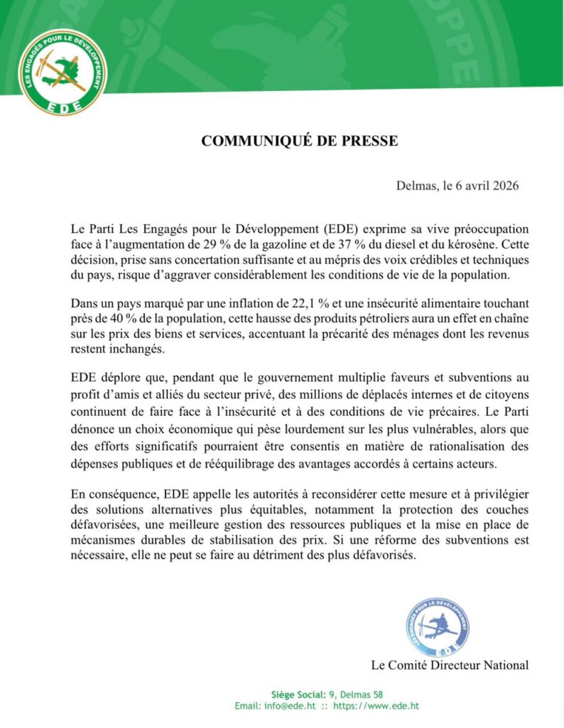 Le parti Les Engagés pour le Développement (EDE) a exprimé sa vive préoccupation face à la récente augmentation des prix des produits pétroliers en Haïti, soit 29 % pour la gazoline et 37 % pour le diesel et le kérosène, dans un communiqué de presse publié à Delmas le 6 avril 2026 par son Comité Directeur National.