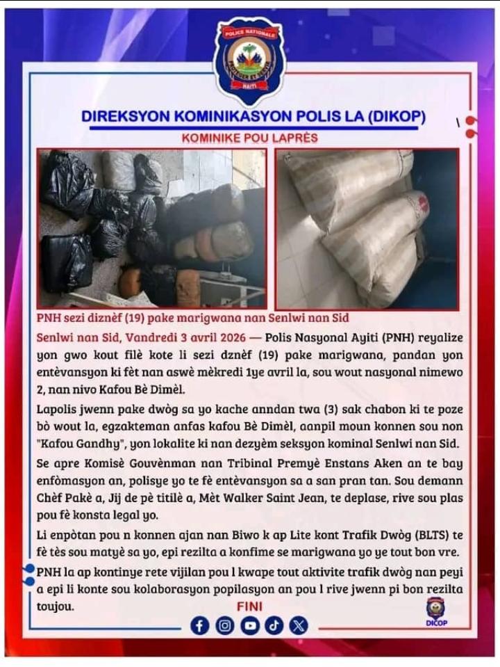 Les substances saisies ont été soumises à des analyses par le Bureau de lutte contre le trafic de stupéfiants (BLTS), qui a confirmé qu’il s’agissait bien de marijuana. La PNH affirme qu’elle reste mobilisée pour lutter contre le trafic de drogue à travers le pays et appelle à la collaboration de la population pour renforcer l’efficacité de ses actions.