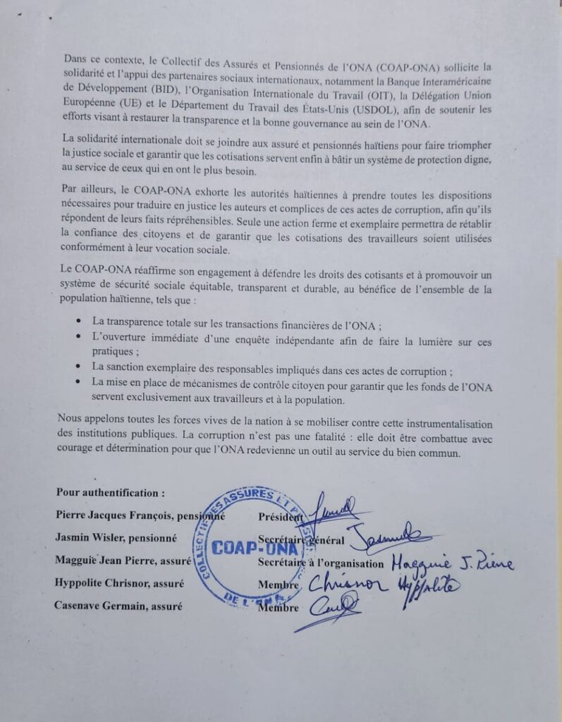 Enfin, le COAP-ONA conclut en appelant les travailleurs, les organisations syndicales et toutes les forces vives à se mobiliser. « La corruption n’est pas une fatalité », écrit-il. « Elle doit être combattue avec courage et détermination pour que l’ONA redevienne un outil au service du bien commun. » La lettre est signée par plusieurs assurés et pensionnés, parmi lesquels Pierre Jacques François, Jasmin Wisler, Magguie Jean Pierre, Hyppolite Chrisnor et Casenave Germain.
