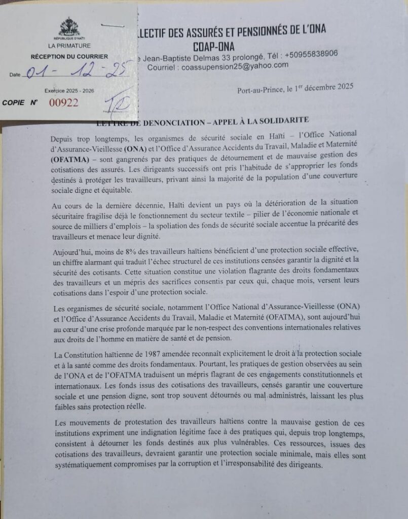 Le Collectif des assurés et pensionnés de l’ONA (COAP-ONA) tire la sonnette d’alarme face à ce qu’il qualifie de « crise profonde » au sein des organismes de sécurité sociale, en particulier l’Office national d’assurance-vieillesse (ONA). Dans une lettre datée du 1er décembre 2025, le Collectif dénonce des « pratiques récurrentes de détournement » et une « mauvaise gestion des fonds destinés aux cotisants », qui compromettent, selon lui, l’avenir même de la protection sociale en Haïti.