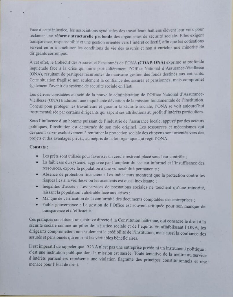 Les représentants du Collectif soulignent également que cette déviation constitue une atteinte directe aux engagements constitutionnels du pays. « L’ONA n’est pas une entreprise privée ni un instrument politique : c’est une institution publique dont la mission est sacrée », rappelle le document, dénonçant une « violation flagrante de la Constitution haïtienne ». Le Collectif insiste sur la nécessité de protéger les ressources des travailleurs, « censées garantir une pension digne et une couverture sociale réelle ».