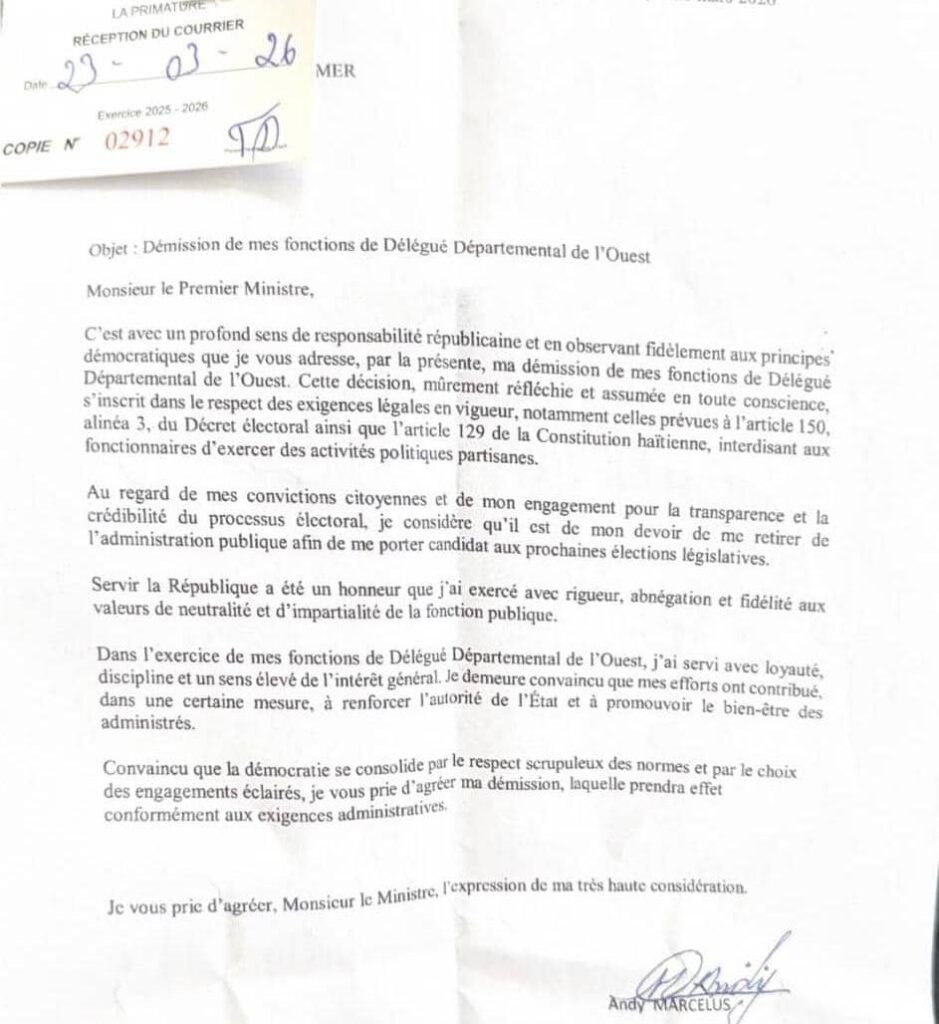 Le délégué départemental de l’Ouest, Andy Marcelus, a officiellement présenté sa démission dans une correspondance adressée au Premier ministre Alix Didier Fils-Aimé. Dans cette lettre, reçue par la Primature le lundi 23 mars 2026, il annonce quitter ses fonctions afin de se porter candidat aux prochaines élections législatives, tout en respectant les exigences légales en vigueur.