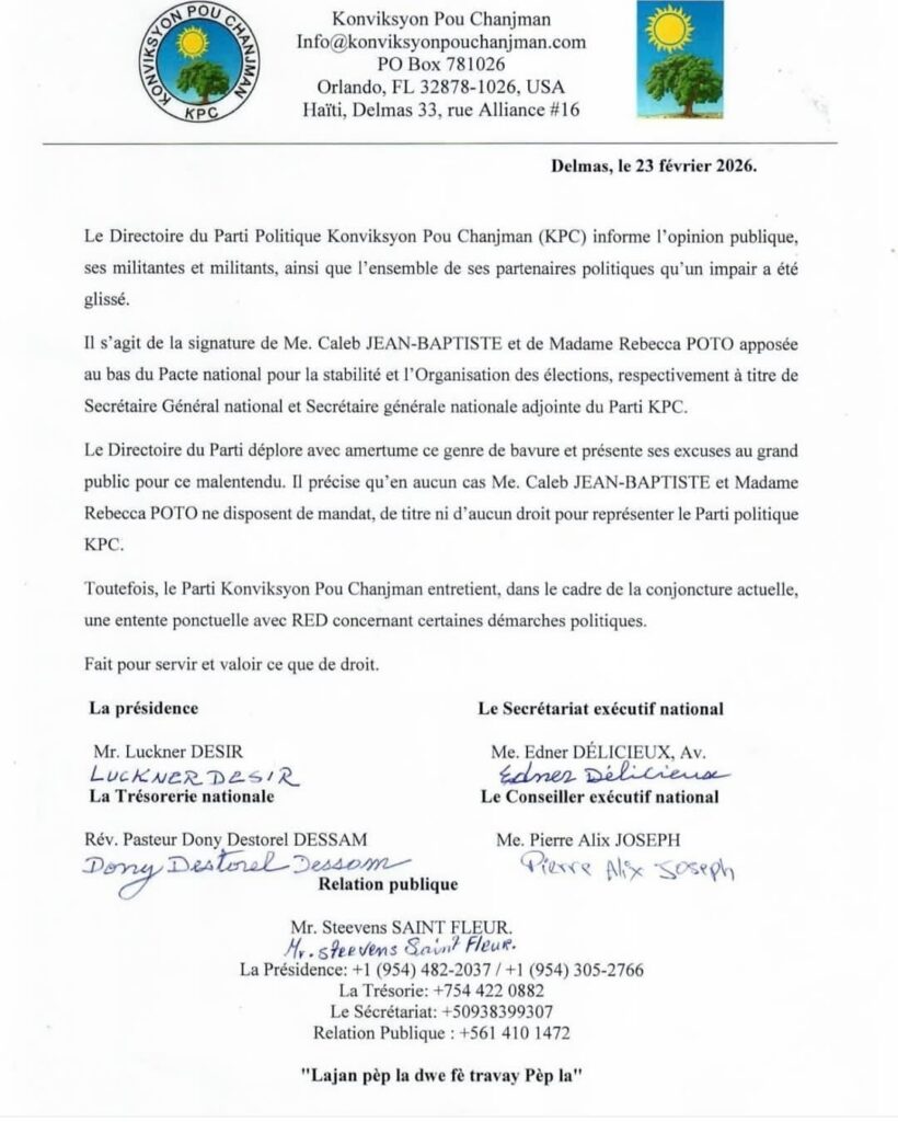 Le Directoire du Parti politique Konviksyon Pou Chanjman (KPC) a annoncé, le 23 février 2026, l’exclusion politique de Caleb Jean-Baptiste, à la suite d’un acte qualifié de « bavure grave ». Dans une note officielle rendue publique à Delmas, la direction du parti informe que Me Jean-Baptiste et Rebecca Poto ont apposé leurs signatures au bas du Pacte national pour la stabilité et l’Organisation des élections sans disposer d’aucun mandat du parti.