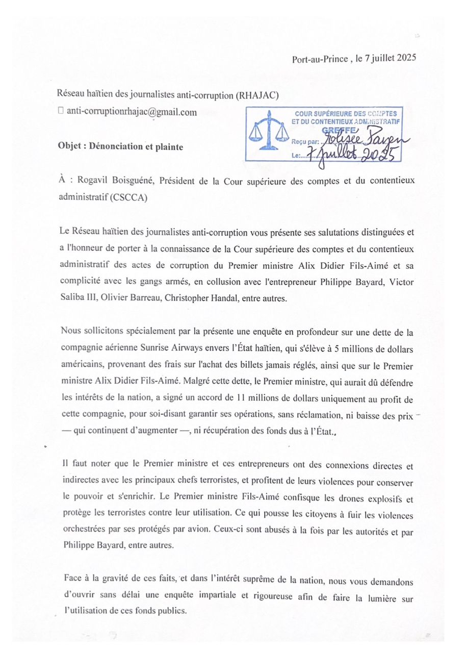 WhatsApp Image 2025-07-07 at 6.44.53 PM Continue ReadingPrevious Haïti : le RHAJAC a formellement déposé une plainte contre le Premier ministre Alix Didier Fils-Aimé à la CSCCA dans l’affaire de Sunrise Airways