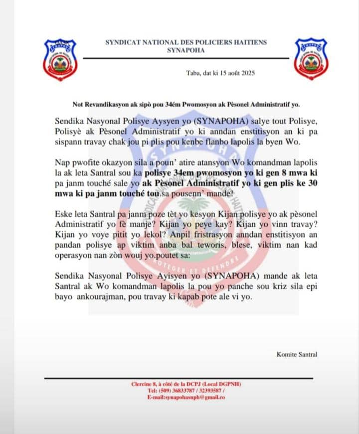 Le Syndicat national des policiers haïtiens (SYNAPOHA) alerte sur la crise salariale qui frappe les policiers de la 34e promotion et le personnel administratif de la Police nationale d’Haïti. Dans une note publiée le 15 août 2025, l’organisation dénonce huit mois d’arriérés de salaire pour les agents et plus de trente mois pour certains employés administratifs. Le syndicat considère cette situation comme une injustice qui fragilise l’institution.