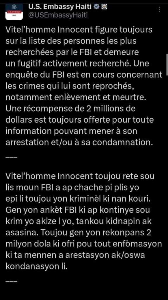 L’Ambassade des États-Unis en Haïti a confirmé ce mardi 24 février 2026 que le chef terroriste Vitel’homme Innocent figure toujours parmi les individus les plus recherchés par le Bureau fédéral d’investigations (FBI). Considéré comme un fugitif dangereux, il demeure activement recherché pour de graves accusations, notamment des enlèvements et des meurtres.