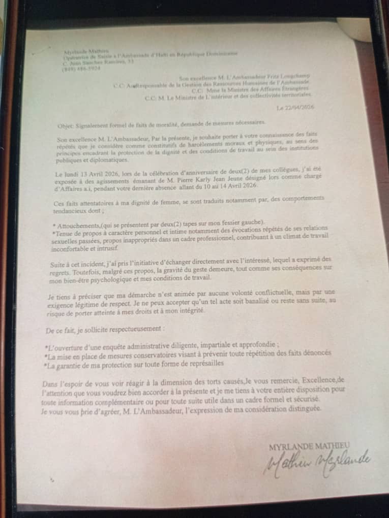 À l’origine de cette décision, une lettre formelle datée du 22 avril 2026, signée par l’agente administrative Myrlande Mathieu, adressée à l’ambassadeur avec copies au ministère des Affaires étrangères, au ministère de l’Intérieur ainsi qu’au service des ressources humaines. Dans ce document, la plaignante dénonce des faits qu’elle qualifie de harcèlement moral et physique, survenus le 13 avril 2026 lors d’une activité interne.
