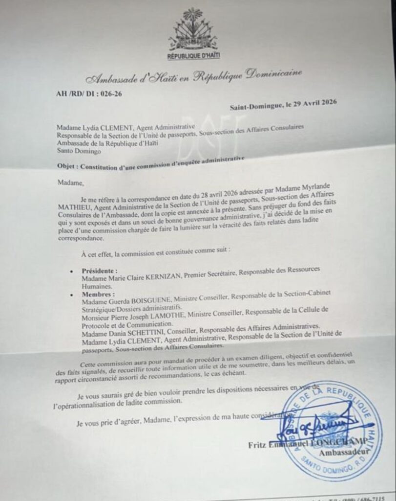 Acculée par les révélations et la pression interne, la mission diplomatique d’Haïti en République dominicaine a été contrainte d’agir dans l’urgence. Moins de 48 heures après la publication de notre article sur l’éclatement d’un acte de harcèlement présumé, une commission d’enquête administrative est officiellement mise en place.
