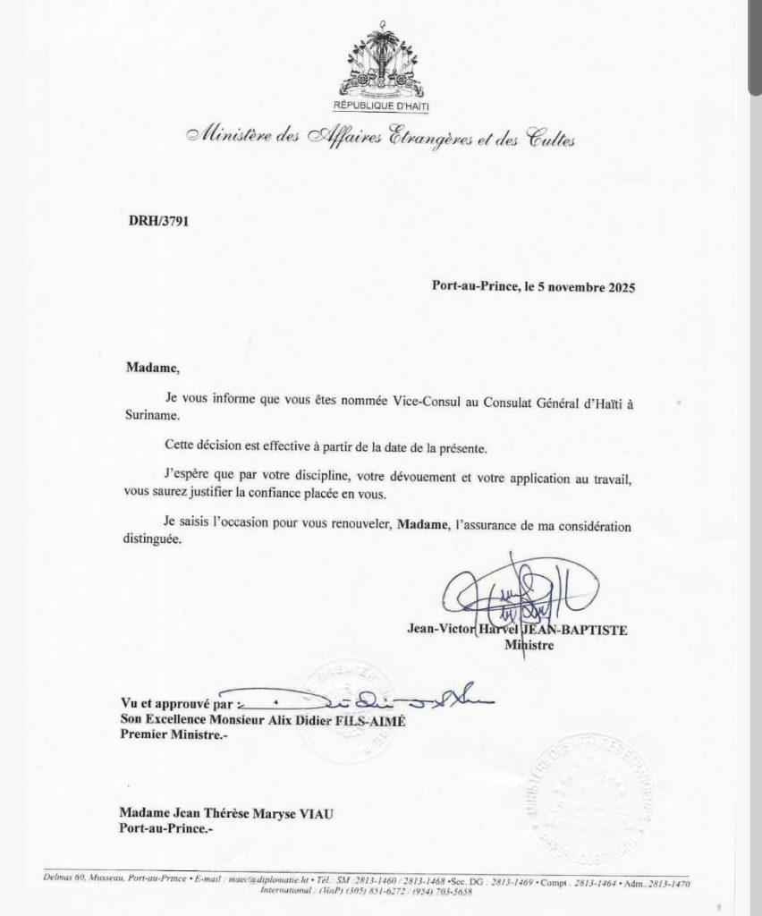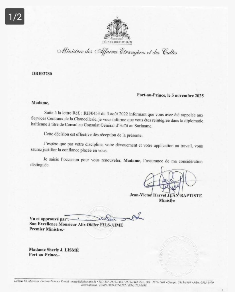 Une lettre officielle datée du 5 novembre 2025 le prouve : sa concubine , Sherly J. Lismé, vient d’être réintégrée dans la diplomatie haïtienne et nommée consul au Consulat général d’Haïti au Suriname.