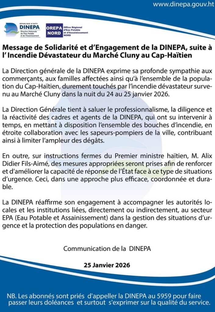 Quelques heures à peine après l’incendie criminel qui a ravagé le marché Cluny, la Direction nationale de l’eau potable et de l’assainissement (DINEPA) s’est empressée de publier un message de « solidarité » saluant la réactivité de ses agents et annonçant, sur instruction du Premier ministre Alix Didier Fils-Aimé, des mesures pour améliorer la gestion des urgences.