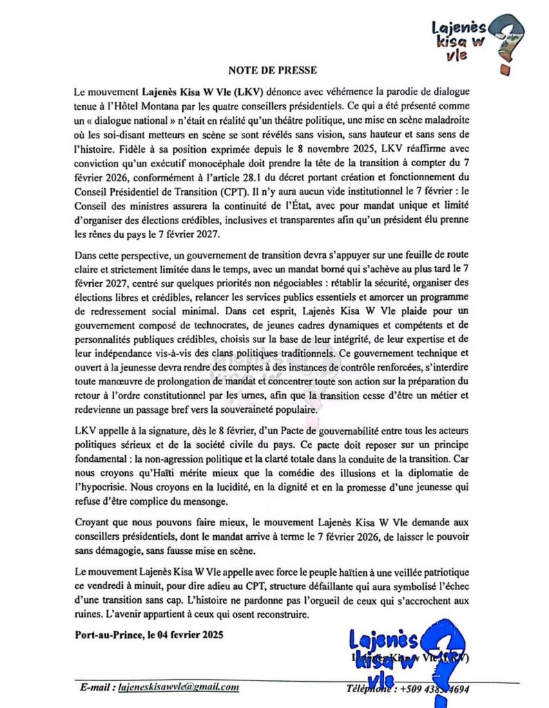 Enfin, LKV demande explicitement aux conseillers présidentiels de quitter leurs fonctions à l’échéance prévue. Le communiqué conclut : « le mouvement Lajenès Kisa W Vle demande aux conseillers présidentiels, dont le mandat arrive à terme le 7 février 2026, de laisser le pouvoir sans démagogie, sans fausse mise en scène ». L’organisation appelle aussi la population à « une veillée patriotique ce vendredi à minuit, pour dire adieu au CPT, structure défaillante qui aura symbolisé l’échec d’une transition sans cap », affirmant que « l’avenir appartient à ceux qui osent reconstruire ».