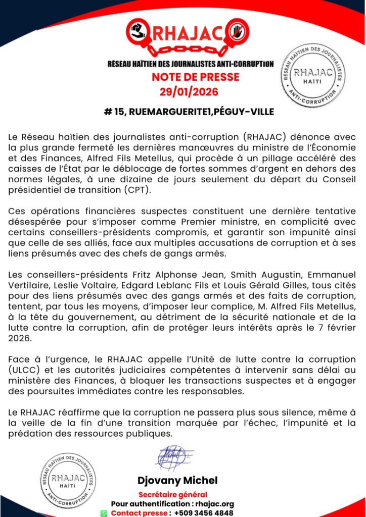 À quelques jours de la fin du Conseil présidentiel de transition, le Réseau haïtien des journalistes anti-corruption (RHAJAC) dénonce un pillage accéléré des caisses publiques au ministère des Finances. Dans une note de presse publiée ce jeudi 29 janvier 2026, l’organisation accuse le ministre Alfred Fils Metellus d’avoir débloqué d’importantes sommes d’argent en dehors des normes légales.