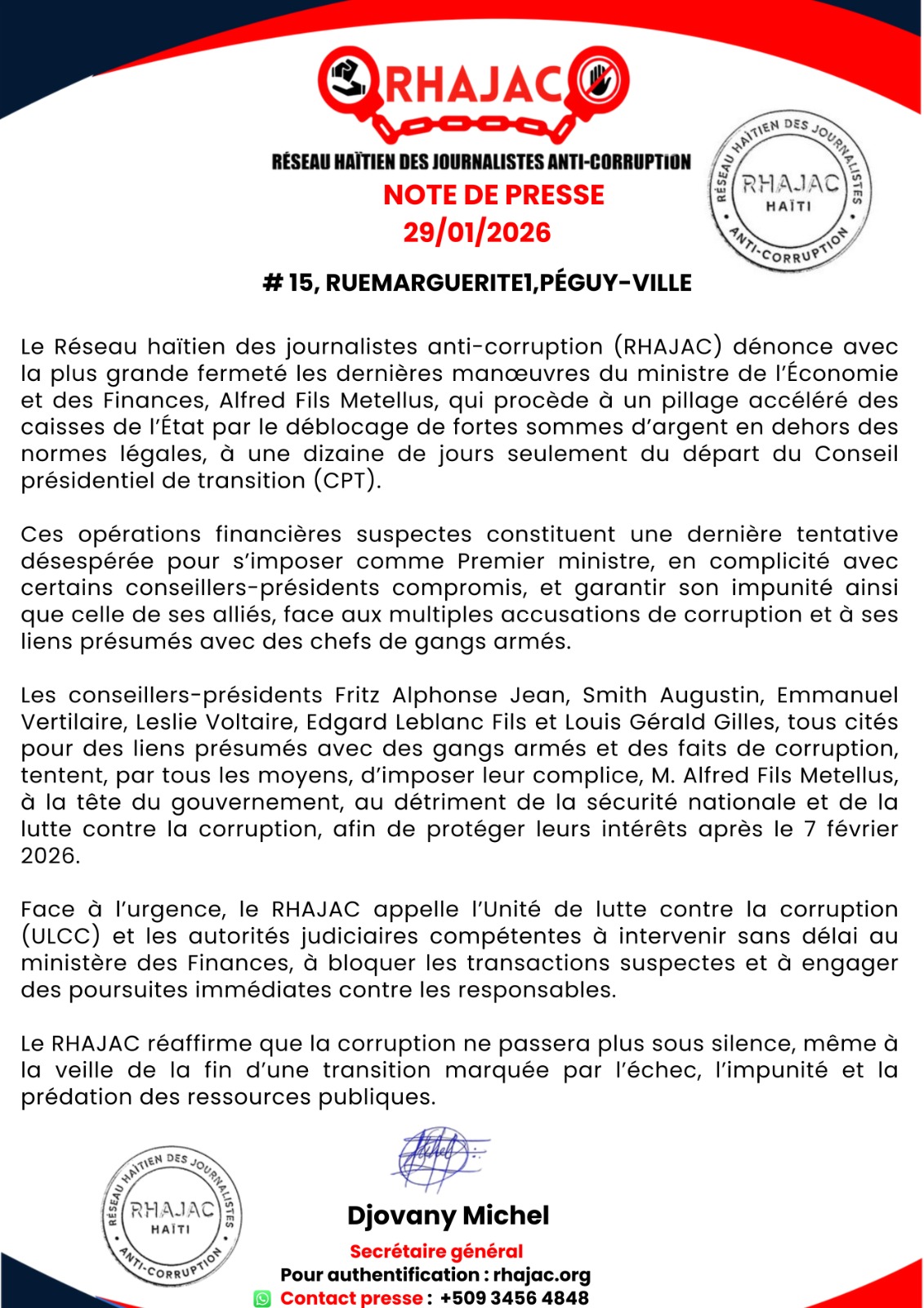 IMG-20260129-WA0011 Continue ReadingPrevious Le Réseau haïtien des journalistes anti-corruption exige un audit d’urgence de l’ULCC sur les décaissements d’Alfred Fils Metellus