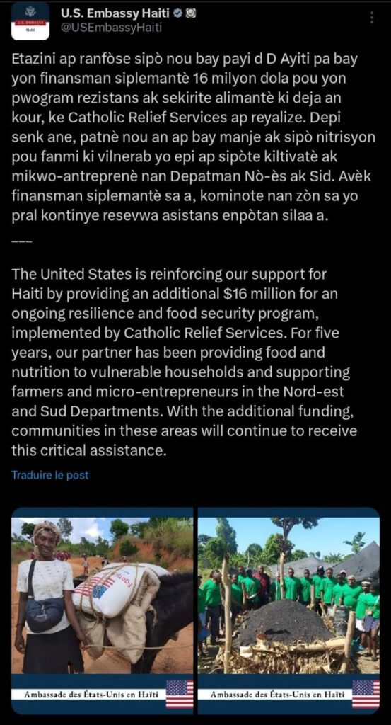 Dans sa déclaration, l’ambassade précise : « Etazini ap ranfòse sipò nou bay peyi d Ayiti pa bay yon finansman siplemantè 16 milyon dola pou yon pwogram rezistans ak sekirite alimantè ki deja an kour, ke Catholic Relief Services ap reyalize. » Ce programme est mis en œuvre par l’organisation humanitaire Catholic Relief Services (CRS), partenaire opérationnel sur le terrain.