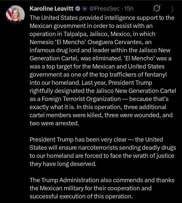 Le message de la porte-parole de la Maison-Blanche, Karoline Leavitt, concernant la neutralisation du chef du cartel mexicain CJNG, Nemesio Oseguera Cervantes, alias El Mencho, le 22 février 2026.