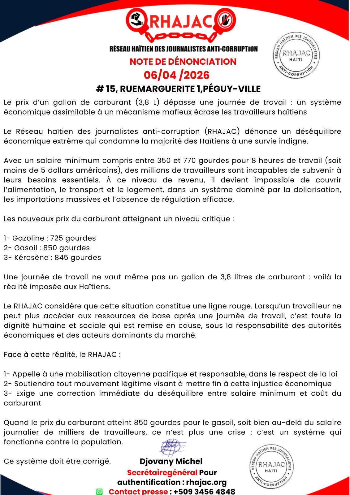 WhatsApp Image 2026-04-06 at 9.42.02 AM Continue ReadingPrevious RHAJAC dénonce et appelle à la mobilisation : en Haïti, un gallon de carburant dépasse une journée de travail