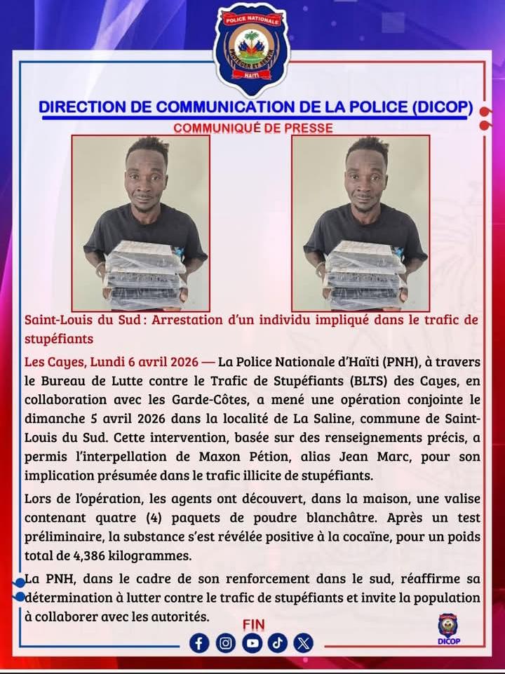 La Police nationale d’Haïti (PNH), à travers le Bureau de lutte contre le trafic de stupéfiants (BLTS) des Cayes, en collaboration avec les Garde-Côtes, a mené une opération conjointe le dimanche 5 avril 2026 dans la localité de La Saline, commune de Saint-Louis du Sud. Cette intervention, basée sur des renseignements précis, a permis l’interpellation de Maxon Pétion, alias Jean Marc, un présumé passeur de cocaïne, pour son implication dans le trafic illicite de stupéfiants.