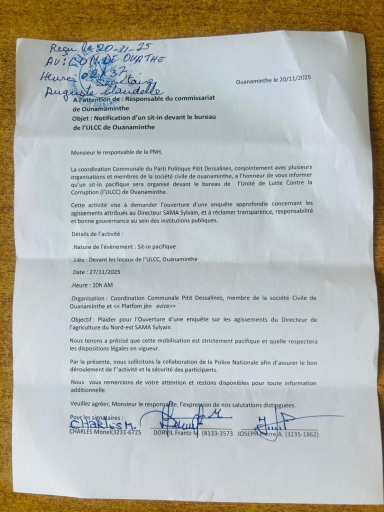 Une photo de la lettre notifiant un sit-in devant le bureau de l’ULCC à Ouanaminthe, publiée le 20 novembre 2025.