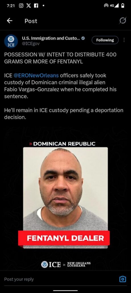 Fabio Vargas-Gonzalez avait été reconnu coupable de possession avec intention de distribuer 400 grammes ou plus de fentanyl, une infraction fédérale particulièrement grave dans le contexte de la crise des opioïdes qui frappe les États-Unis. Après avoir purgé sa peine, il a été transféré sous la garde des services d’immigration, conformément aux procédures en vigueur pour les ressortissants étrangers condamnés pour crimes graves.