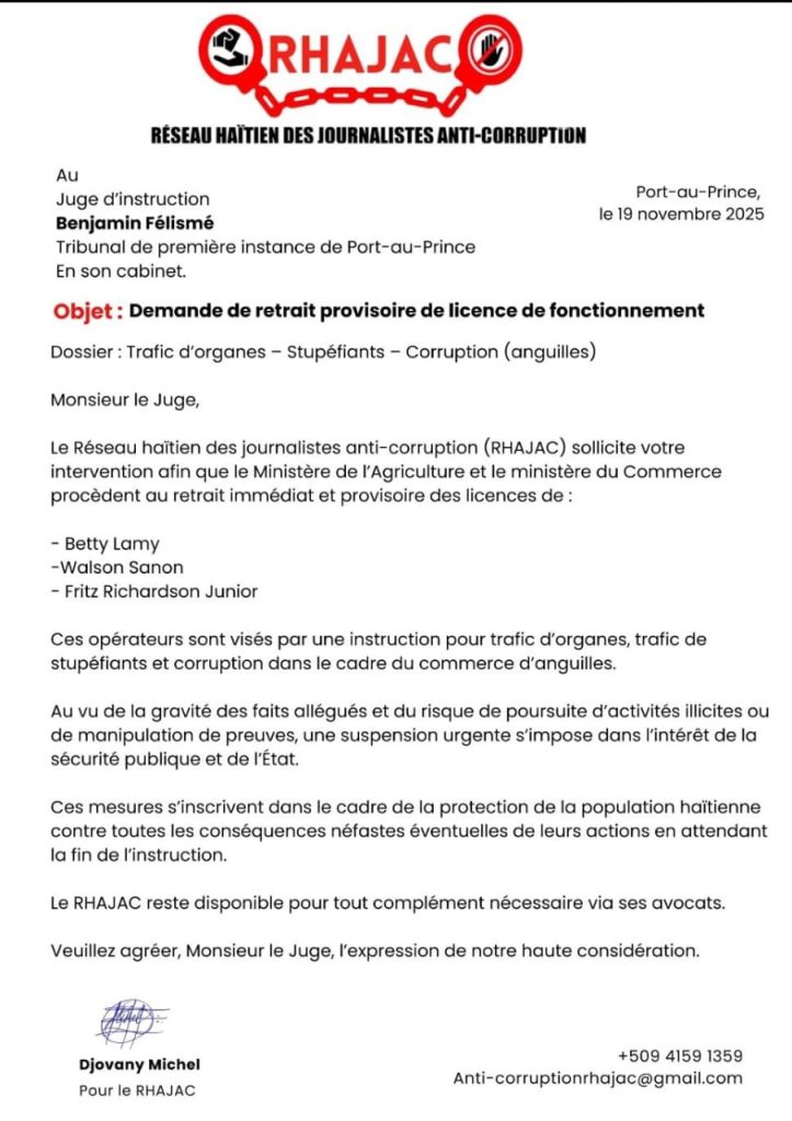 2 min readLe Réseau haïtien des journalistes anti-corruption (RHAJAC) a officiellement sollicité, le mercredi 19 novembre 2025, l’intervention du juge d’instruction Benjamin Félismé dans le cadre d’un vaste dossier impliquant plusieurs opérateurs économiques. Selon la correspondance adressée au magistrat, trois individus, Betty Lamy, Walson Sanon et Fritz Richardson Junior, sont visés par une instruction portant sur trafic d’organes, trafic de stupéfiants et corruption liée au commerce des anguilles.