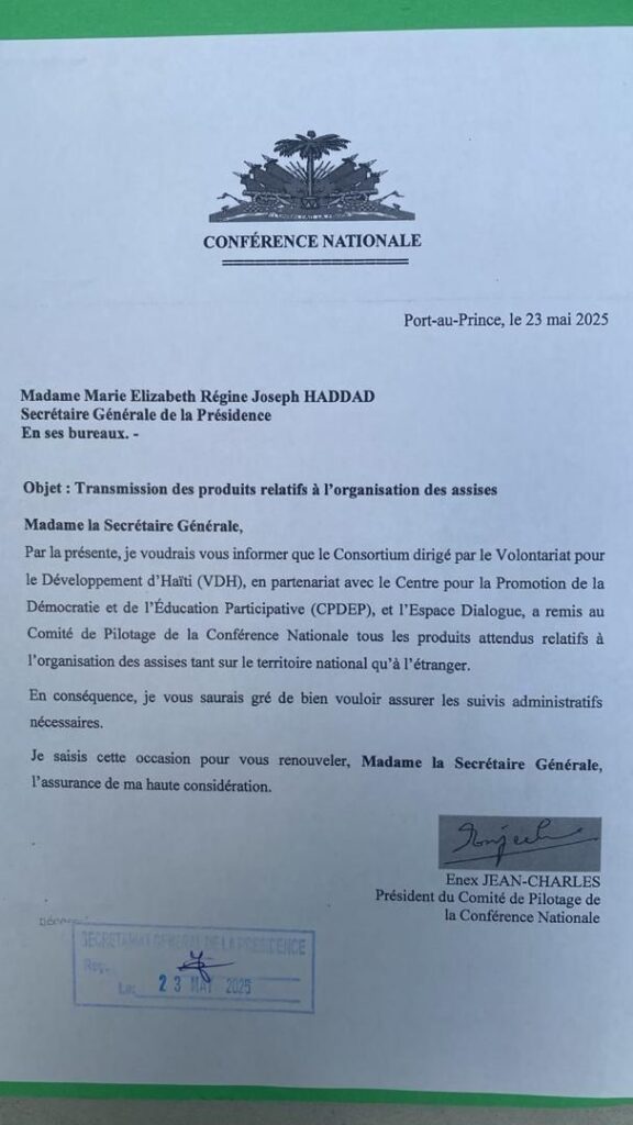 Une correspondance datée du 23 mai 2025, adressée à la Secrétaire générale de la Présidence, Marie Elizabeth Régine Joseph Haddad, apporte un éclairage nouveau dans l’affaire opposant le bureau d’Arnoux Descardes aux accusations selon lesquelles il n’aurait pas remis les rapports attendus. Le document, signé par Enex Jean-Charles, président du Comité de pilotage de la Conférence nationale, confirme sans ambiguïté que tous les produits relatifs à l’organisation des assises — tant sur le territoire national qu’à l’étranger — ont bien été livrés à la Présidence.