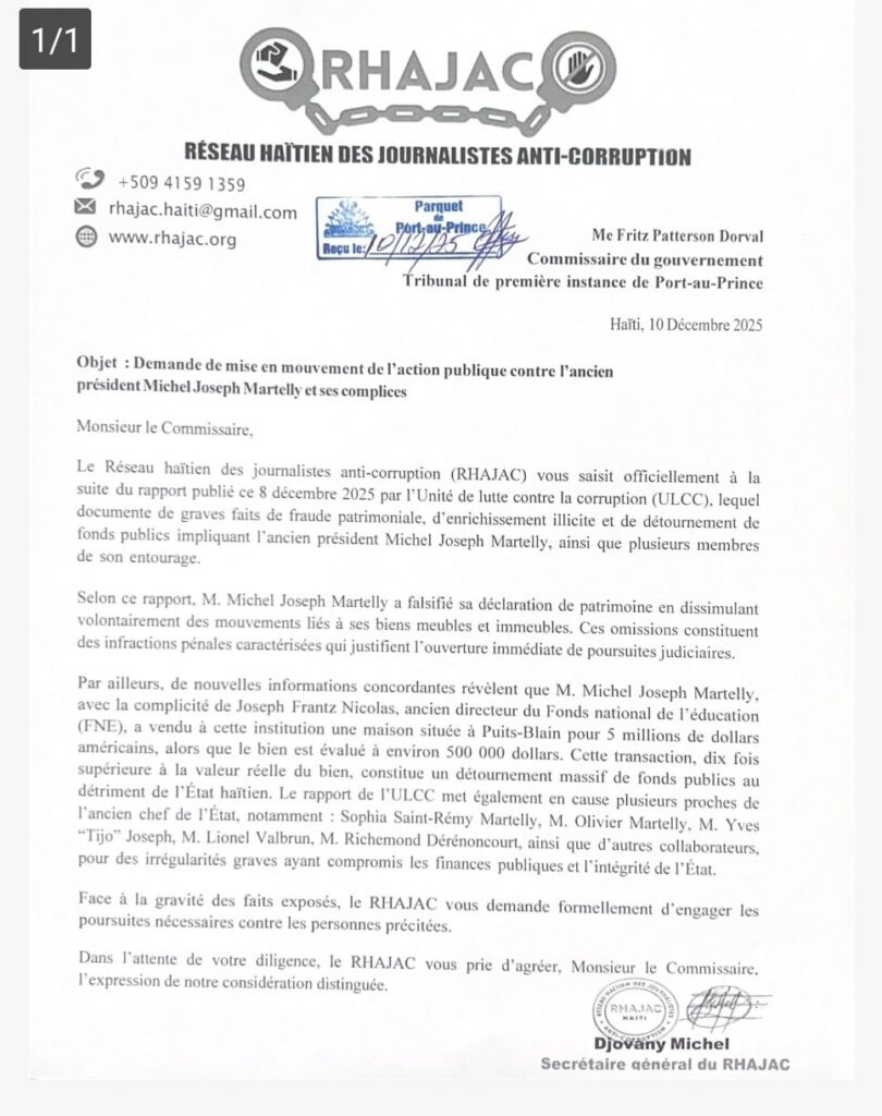 Le RHAJAC, par la voix de son secrétaire général Djovany Michel, estime que les faits sont suffisamment graves pour justifier une action immédiate du parquet. L’organisation rappelle que la lutte contre la corruption ne peut avancer tant que ceux qui ont contribué au pillage de l’État continuent de bénéficier de l’impunité.
