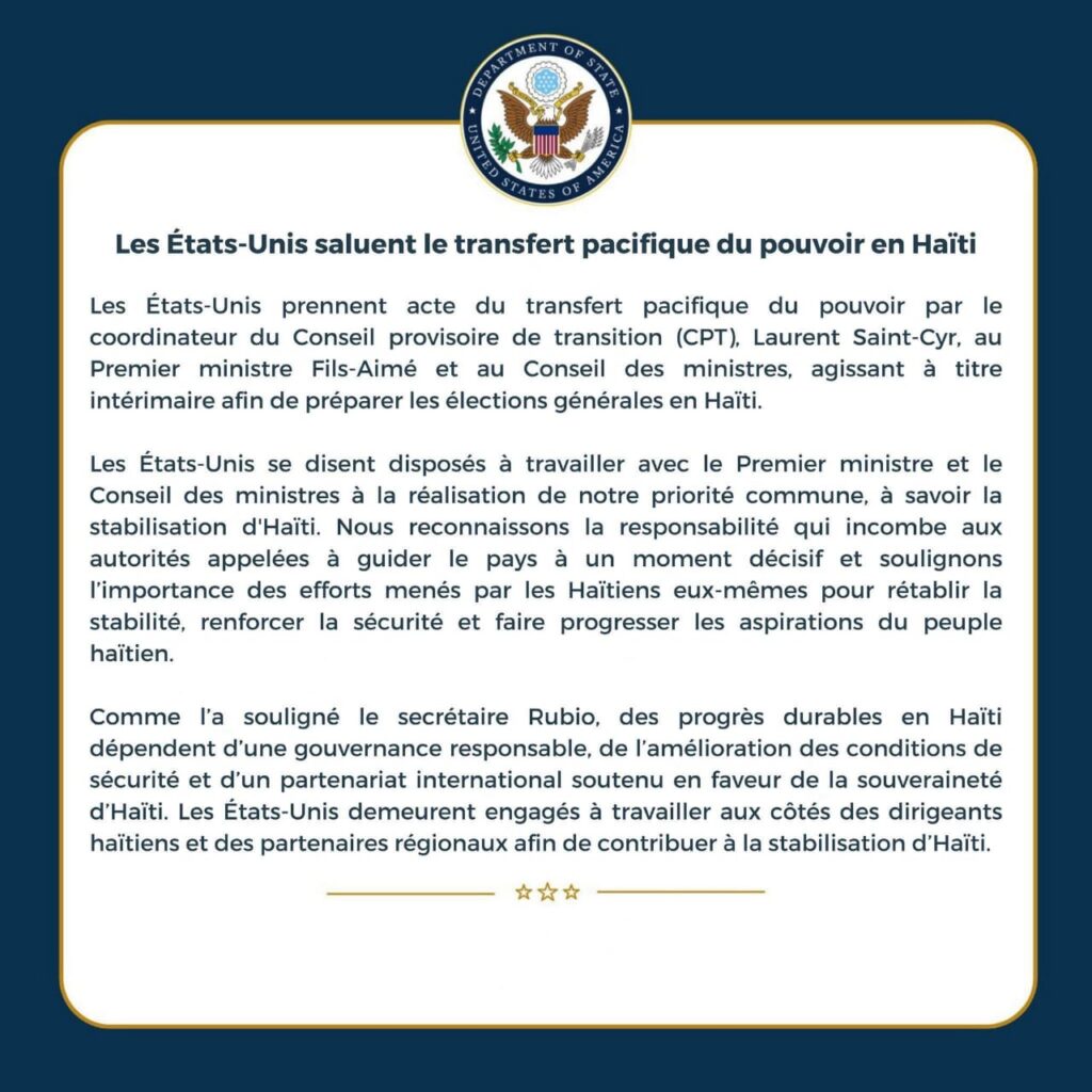 Dans une déclaration, les autorités américaines ont indiqué être « disposées à travailler avec le Premier ministre et le Conseil des ministres à la réalisation de notre priorité commune, à savoir la stabilisation d’Haïti ». Elles ont également reconnu « la responsabilité qui incombe aux autorités appelées à guider le pays à un moment décisif », tout en soulignant « l’importance des efforts menés par les Haïtiens eux-mêmes pour rétablir la stabilité, renforcer la sécurité et faire progresser les aspirations du peuple haïtien ».